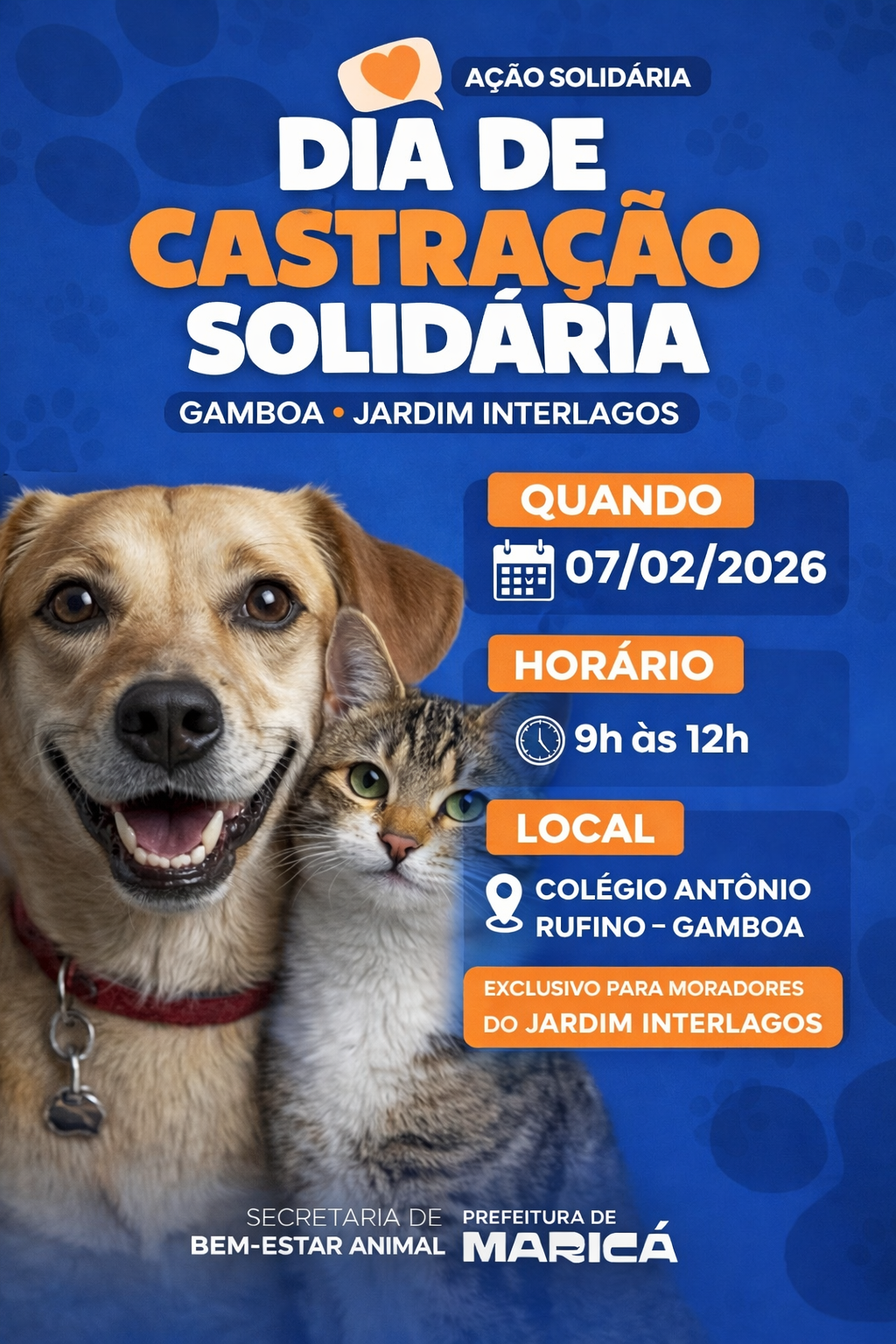 A Prefeitura de Maricá, por meio da Secretaria de Bem-Estar Animal, realiza a triagem para Castração Solidária no bairro Gamboa Jardim Interlagos, uma importante ação voltada à saúde, ao controle populacional e à posse responsável de cães e gatos neste sábado, dia 07, das 9h às 12h, é mais uma edição da Ação de Castração Solidária, a triagem será na Escola Municipal Antônio Rufino de Souza Filho, no bairro da Gamboa.